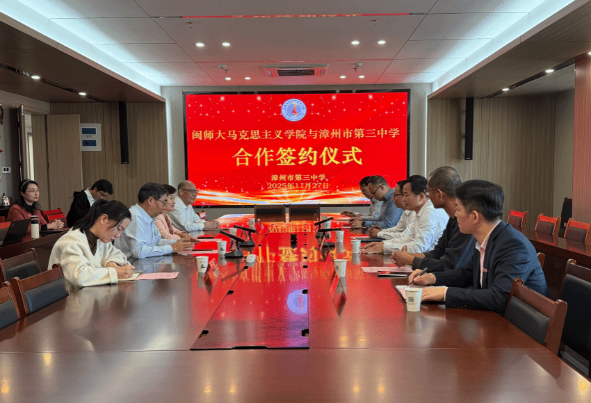 为深化校校协同合作,整合优质教育资源,11月27日下午,学院与漳州第三中学举行 “教育协同发展战略” 合作签约仪式。学院党委书记方琼、院长陈再生、副院长黄耀明、教工党支部书记郑育琛,漳州三中党总支书记庄清寿、校长黄志勇及教师代表参加签约仪式。
