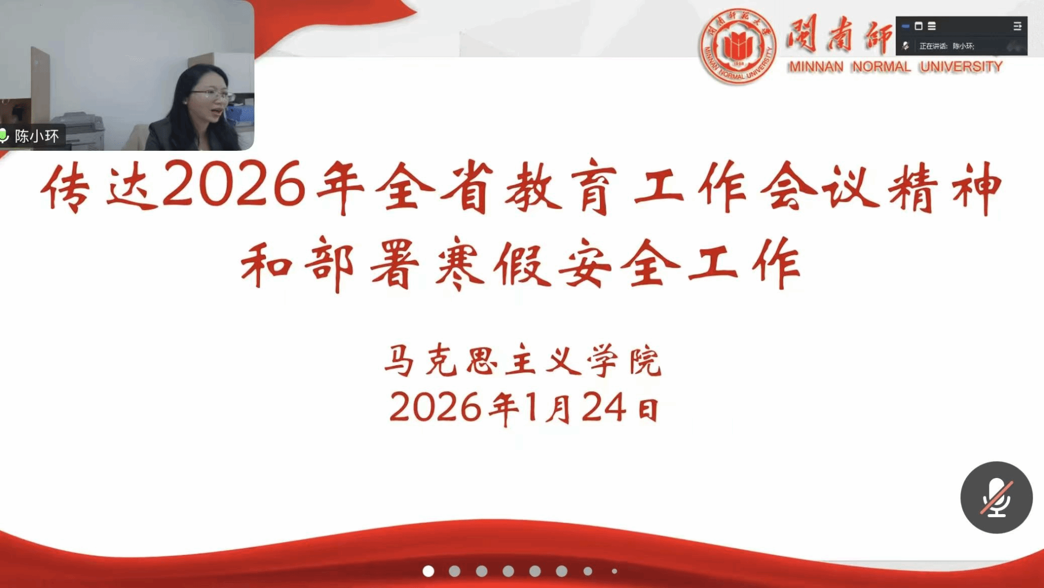 会上,学院党委副书记(主持党委工作)陈小环首先传达2026年全省教育工作会议精神。她指出,要深入贯彻会议提出的“坚持为党育人、为国育才,推进教育高质量发展”核心要求,紧扣教育强省建设目标,将立德树人根本任务贯穿教育教学全过程。结合寒假工作安排,陈小环提出“放假不放松、责任不缺位”的工作准则。强调要筑牢安全防线,重点做好师生出行安全、校园消防安全、留校人员管理等工作,强化安全隐患排查整治,确保全院师生度过平安祥和的假期。