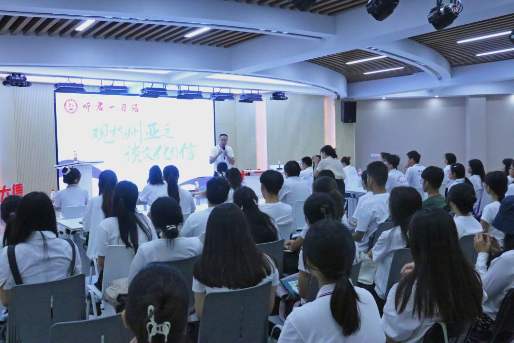 在达理学生活动中心三楼举办“听君一习话”师生联学活动,本期主题为“观杭州亚运,谈文化自信”。活动共吸引六个学院近100人参加,文学院苏琦,历史地理学院卢毅琳,新闻传播学院许思思,体育学院林起盛,盈丰娱乐