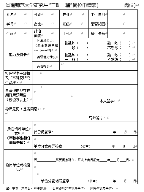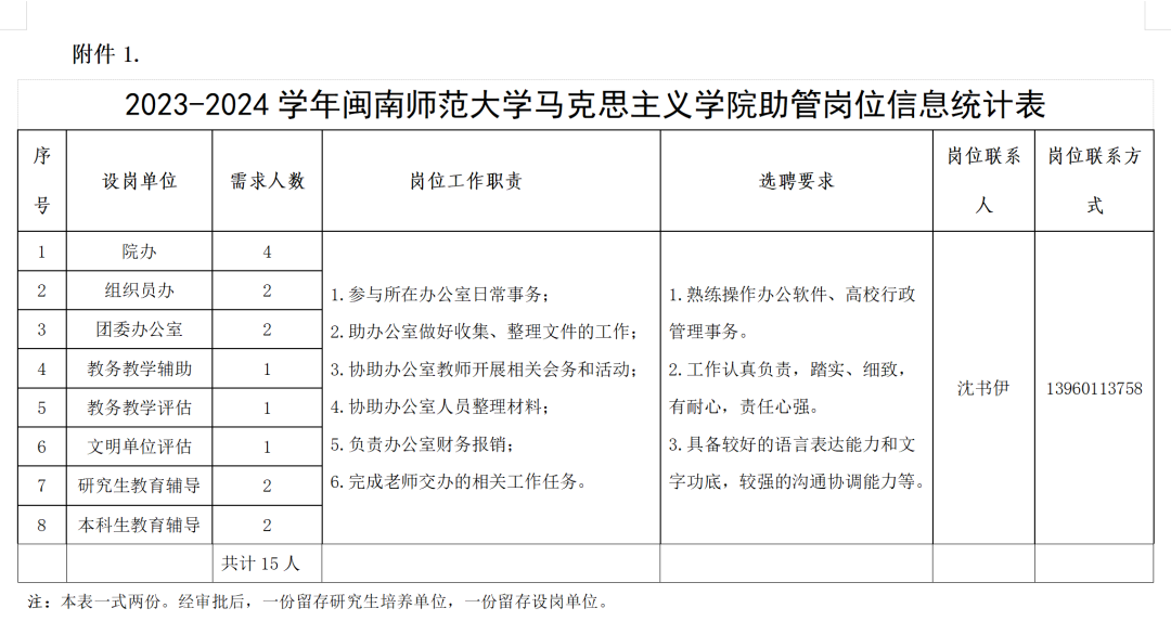 符合条件的学生9月22日18点前提交《闽南师范大学2023-2024学年研究生“三助一辅”岗位申请表》(附件2)至邮箱[email protected],个人提交文件名和邮件名为“班级+姓名+应聘岗位”,并递交纸质版申请表至综合楼中区209。考核时间地点另行通知。