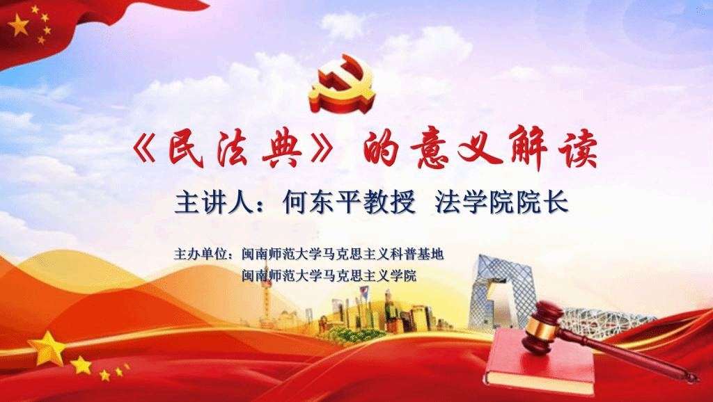 及校马克思主义科普基地联合主办的《中华人民共和国民法典》普法专题讲座在励志130举行。法学院院长何东平教授应邀做了题为《“民之基,国之远”--<民法典>的意义解读 》的精彩讲座。盈丰娱乐