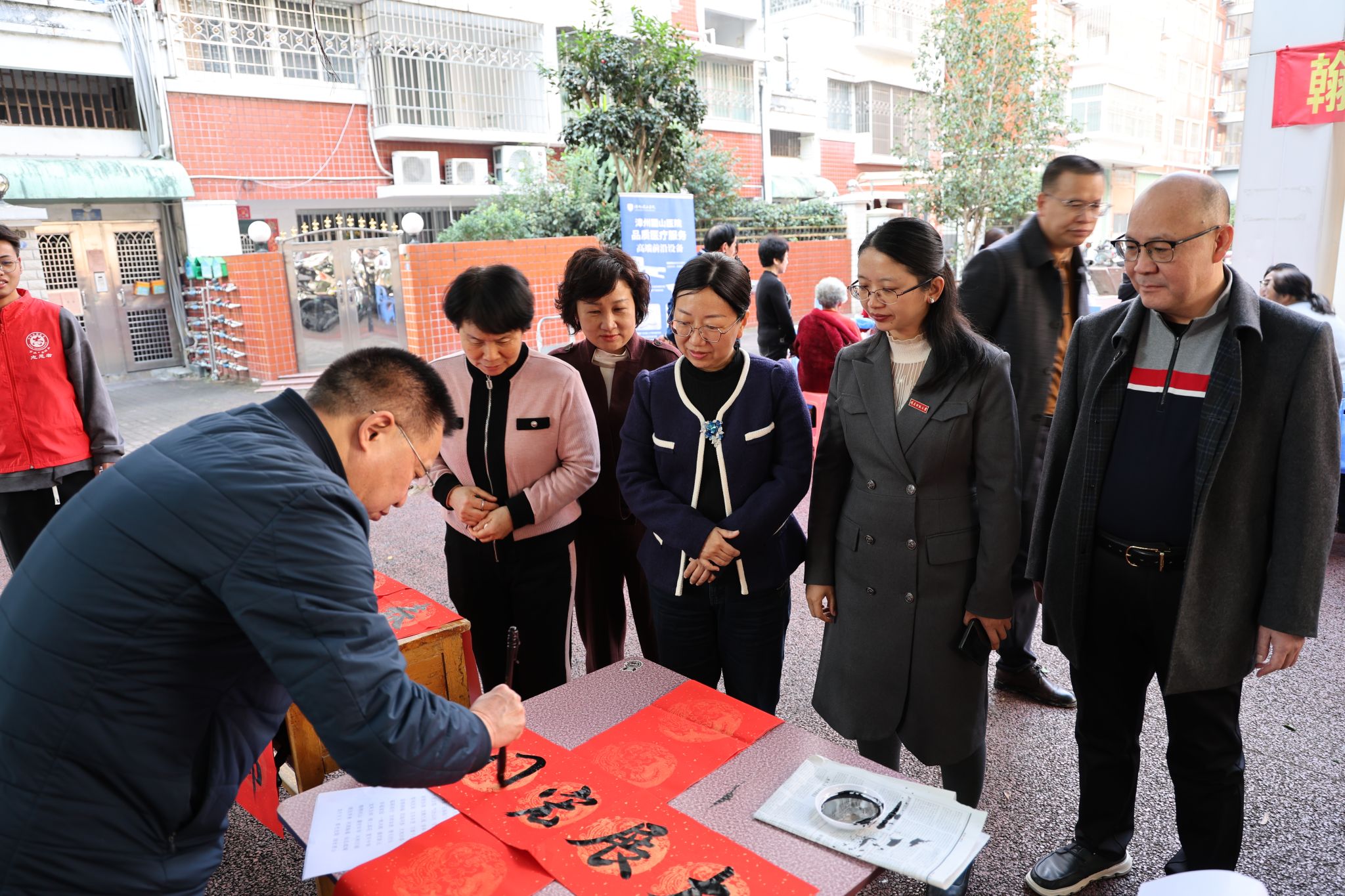 联合学校工会、离退休干部管理处,及漳州圆山医院、芗城区芝山街道办事处、东铺头街道师院社区,在惠民花园三期近邻广场、瑞鑫小区同步开展“金马迎春 福满社区”义写春联暨义诊进社区便民服务活动,以翰墨传情、科普惠民、健康护航等多重暖心举措,为社区居民送上新春祝福与贴心关怀。闽南师范大学党委副书记、工会主席廖志丹莅临现场指导。
