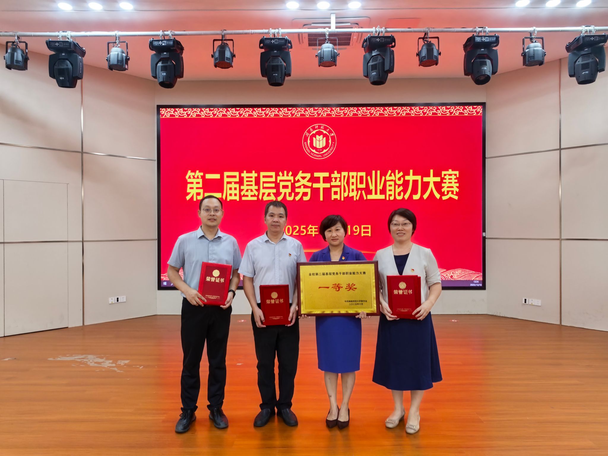在学校举办的第二届基层党务干部职业能力大赛中喜获团体一等奖。本次比赛全校共15支代表队参赛,比赛内容包含党务知识测试、主题党日活动策划、微党课展示、谈心谈话四个环节。盈丰娱乐