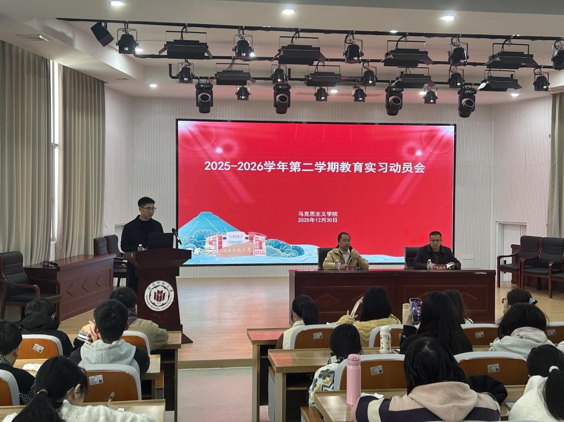 礼堂举行2023级本科生实习动员大会,院党委副书记邓战军、思想政治教育系主任景云做实习工作部署和指导。会议由辅导员任程龙主持,全体2023级本科生参加。(通讯员 李颖诺)