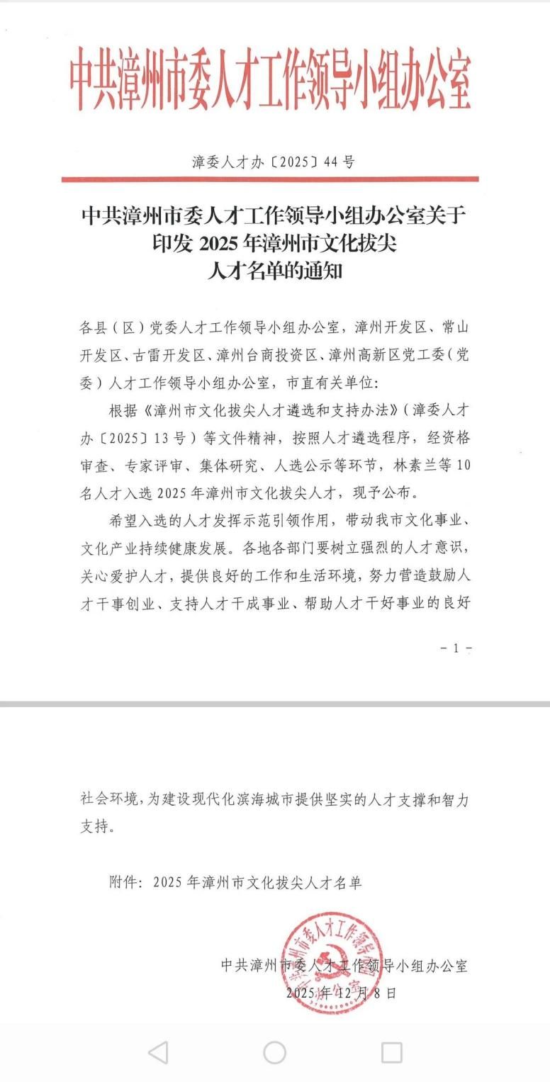 近日,中共漳州市委人才工作领导小组办公室正式公布2025年漳州市文化拔尖人才名单,盈丰娱乐