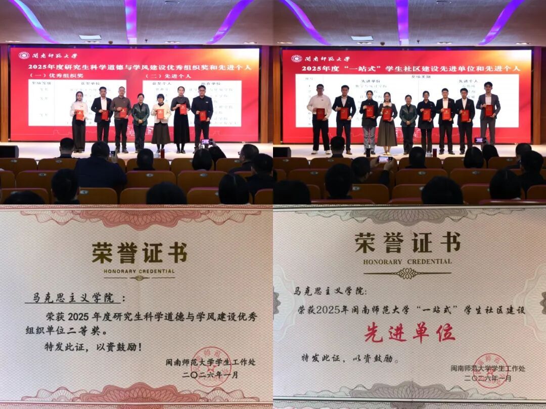 在校2025年学生工作总结表彰大会上荣获“研究生科学道德与学风建设优秀组织单位”和“学生社区建设先进单位”称号,团委书记潘怀杰和辅导员沈书伊获评先进个人。同时,盈丰娱乐